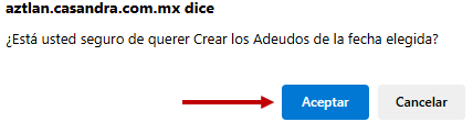 Para confirmar la Creación de Adeudos, pulsa Aceptar en el mensaje emergente.