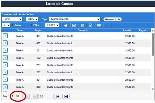 Casandra permite generar los adeudos periódicos regulares de manera sencilla al inicio de mes, siempre que exista una Regla de Cuota vigente, mediante la función de Lote de Cuotas.