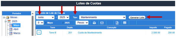 Para crear el Lote, con ayuda de filtros, indica Mes, Año y Tipo de Cuota del periodo a crear, pulsa Generar Lote.