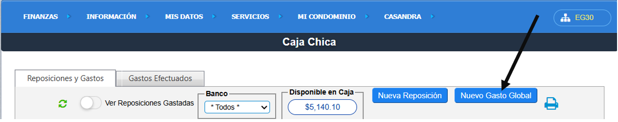 Usa la ruta: Finanzas - Egresos - Caja Chica, da click en el botón Nuevo Gasto Global y llena los campos; es muy importante que se asigne a la Clase de Gasto correcta.