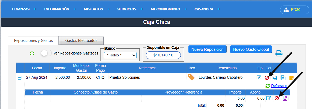 Si quieres eliminar una Reposición deberás eliminar todos los Gastos que contenga, para activar el ícono de el circulo rojo que te permitirá eliminarlo.
