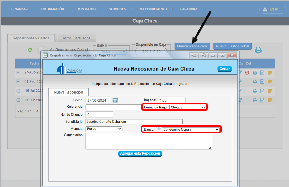 Usa la ruta: Finanzas - Egresos - Caja Chica, da click en el botón Nueva Reposición y llena con los datos que solicita cada campo. Elige la Forma de Pago, el Banco y asigna el número consecutivo.