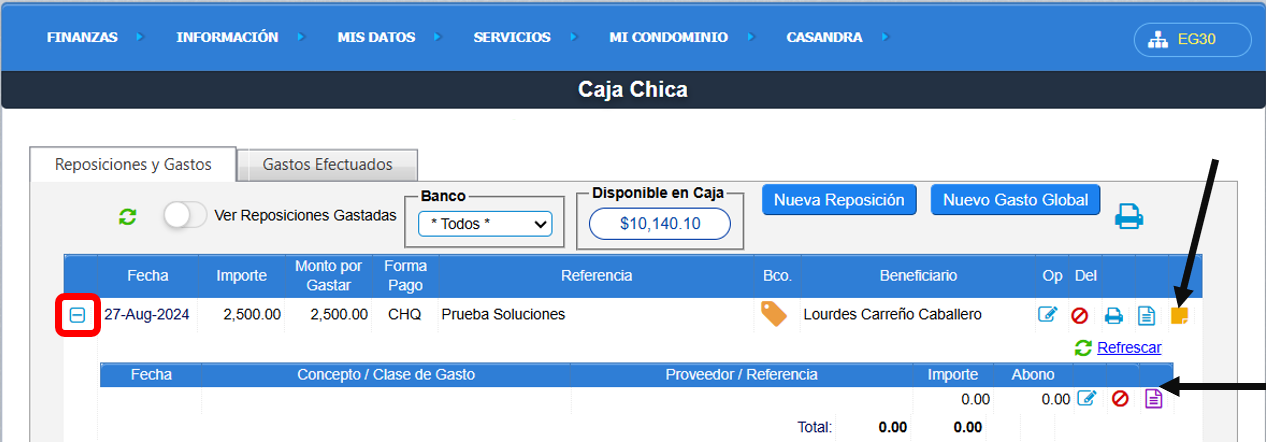 Una vez que se registre el Gasto, se restará de la Reposición hasta que esta termine en cero y entonces podrás consultarla activando el interruptor de Reposiciones Gastadas.
