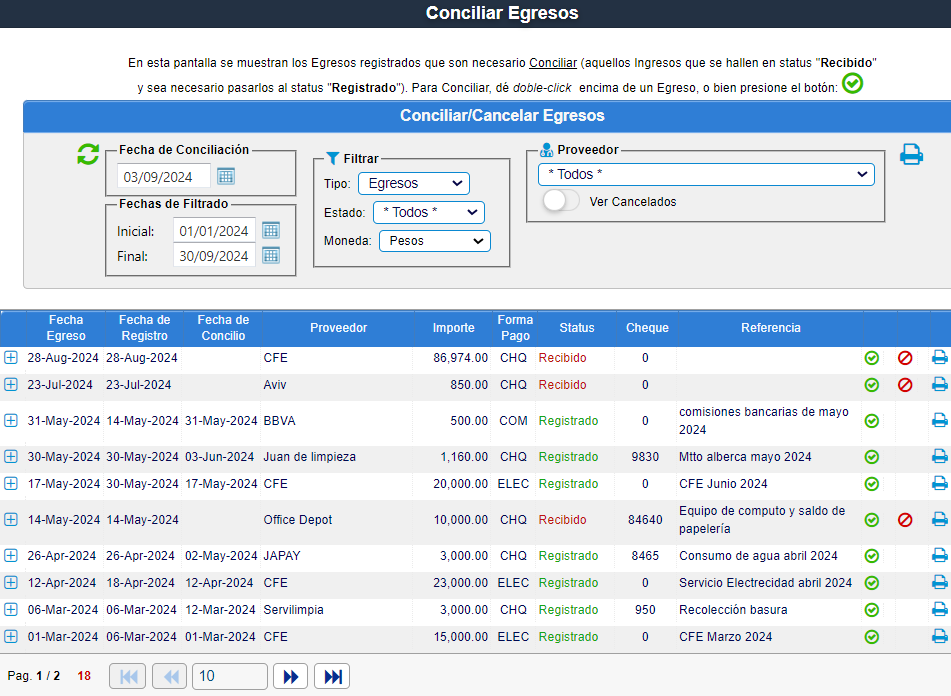 1. Ingresa a Finanzas- Egresos- Conciliar/Cancelar Egresos. Utiliza los filtros de fecha y/o proveedor para ubicar el registro del pago.