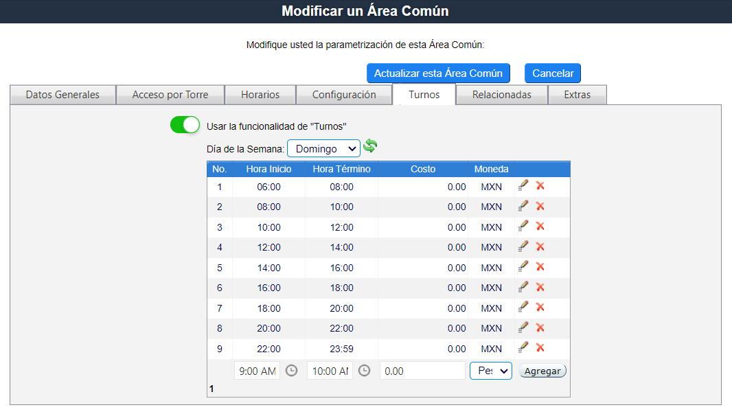 En la pestaña Turnos activa el interruptor Usar la funcionalidad de “Turnos”selecciona los días y define la hora inicial y final de cada turno. Una vez concluida la configuración en cada uno de los días correspondientes, guarda los cambios con la opción Actualizar esta Área Común.