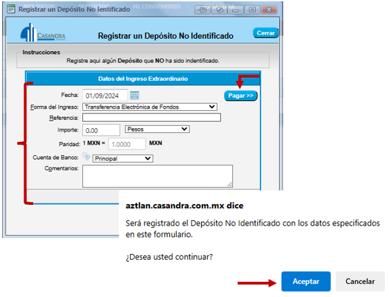 En la pantalla que se muestra registra la información que se te solicita; da click en Pagar para concluir y en el mensaje emergente Aceptar para registrar el Ingreso.
