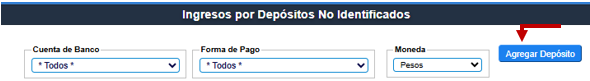 Para ello ingresa a Finanzas - Ingresos - Depósitos No Identificados. Pulsa sobre la función Agregar Depósito.