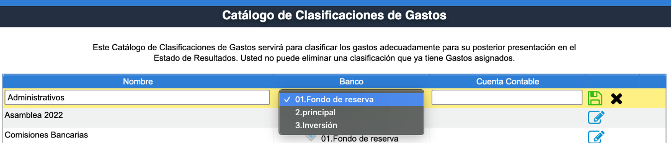 1. Los cambios en egresos se realizan en Finanzas- Egresos- Catálogo de Clase de Gasto. Edita la cuenta de banco de todos los conceptos, utilizando el ícono en forma de lápiz, finalmente guarda los cambios con el botón en forma de discket.