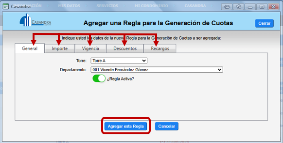 - En caso de que los importes o condiciones de la Regla varíen en cada unidad privativa, solicita a soporte@casandra.com.mx que realice la carga de Regla de forma masiva.