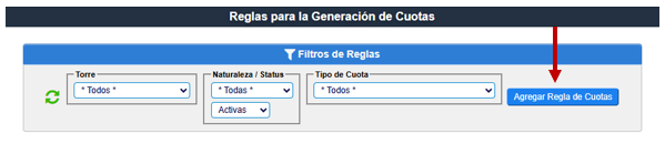 - Si el importe de cuota es igual para todo el condominio, basta con generar una sola Regla por Torre, Subcondominio o Clúster, según aplique a tu edificio.