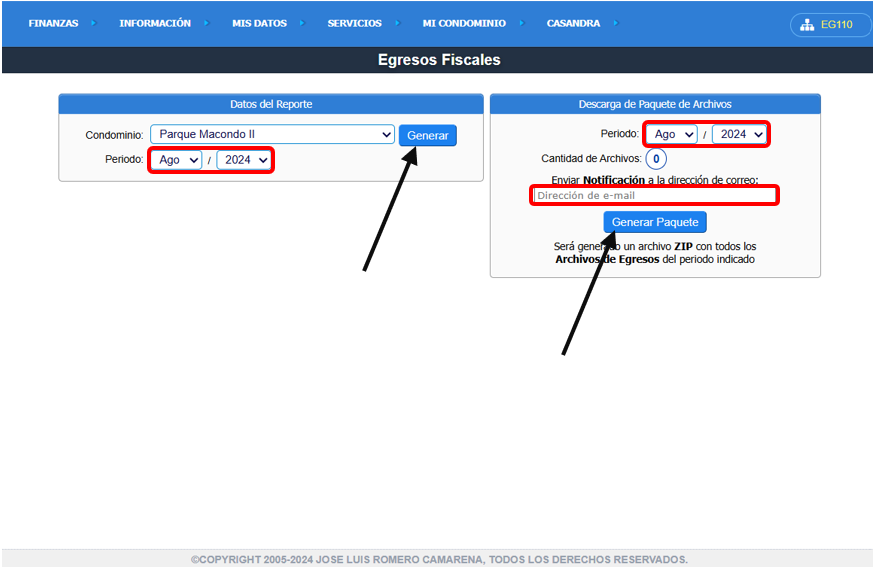 EGRESOS FISCALES. Para los condominios donde cuenten con timbrado de facturación, este reporte les genera un listado de egresos del periodo seleccionado junto con los archivos que se adjuntaron al momento que se Registró la Factura o bien, envía un zip a la dirección electrónica que se indique.