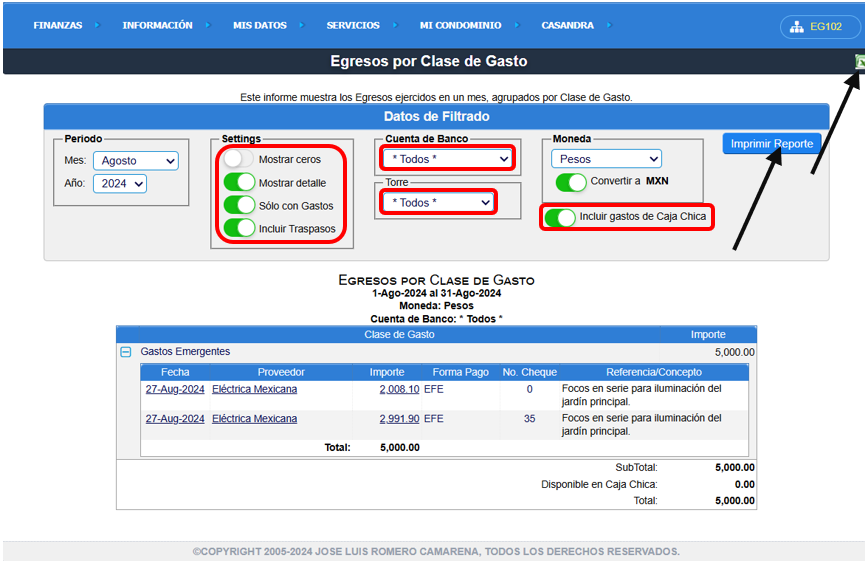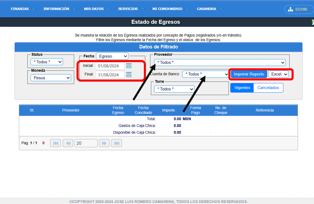 La ruta es: INFORMACIÓN – Estado de Egresos, este reporte es exportable en Excel y PDF.